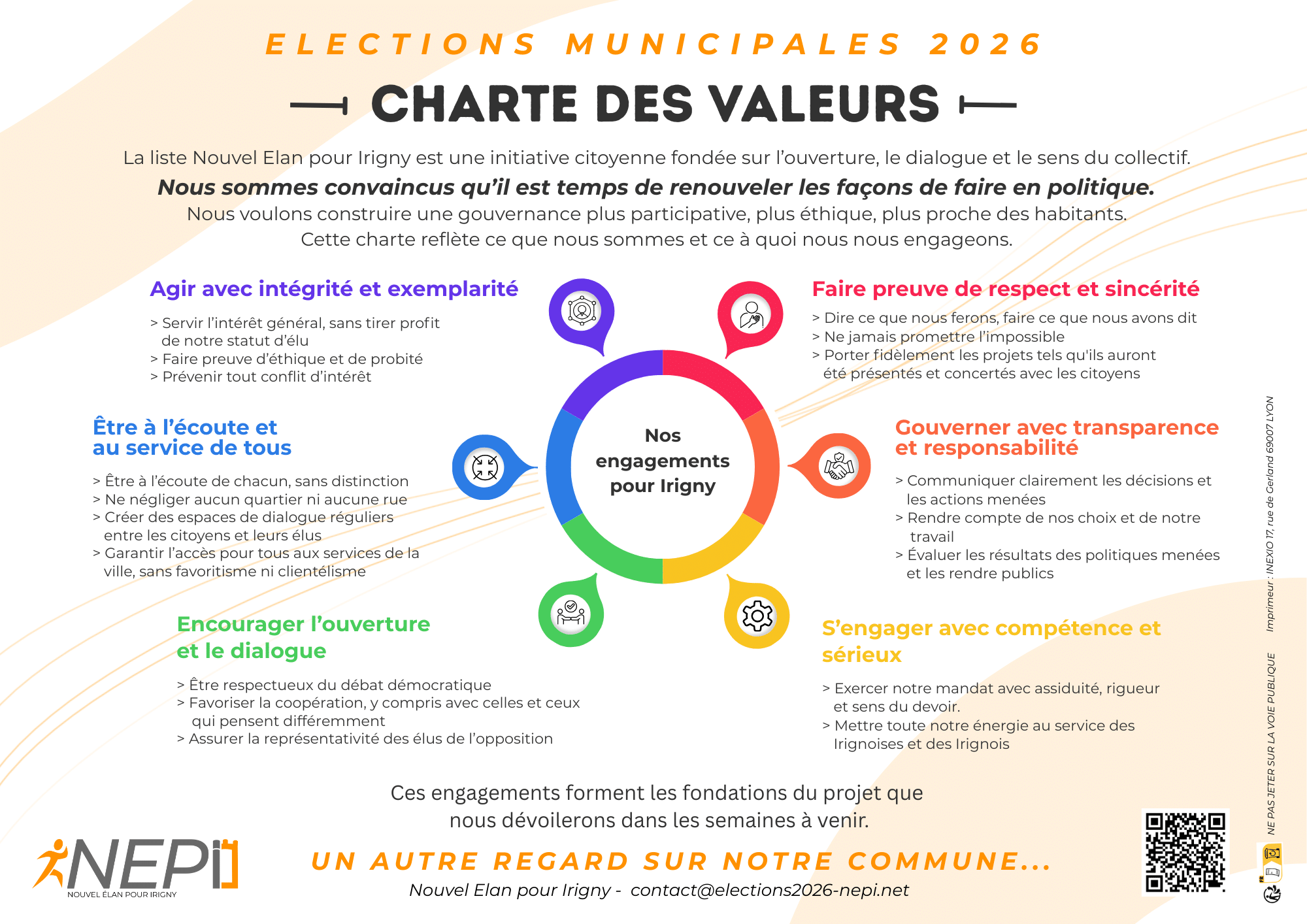 Dans le cadre de la préparation des élections municipales, le collectif Nouvel Élan pour Irigny a élaboré et diffusé une charte des valeurs, socle politique et éthique de son engagement au service des Irignoises et des Irignois.